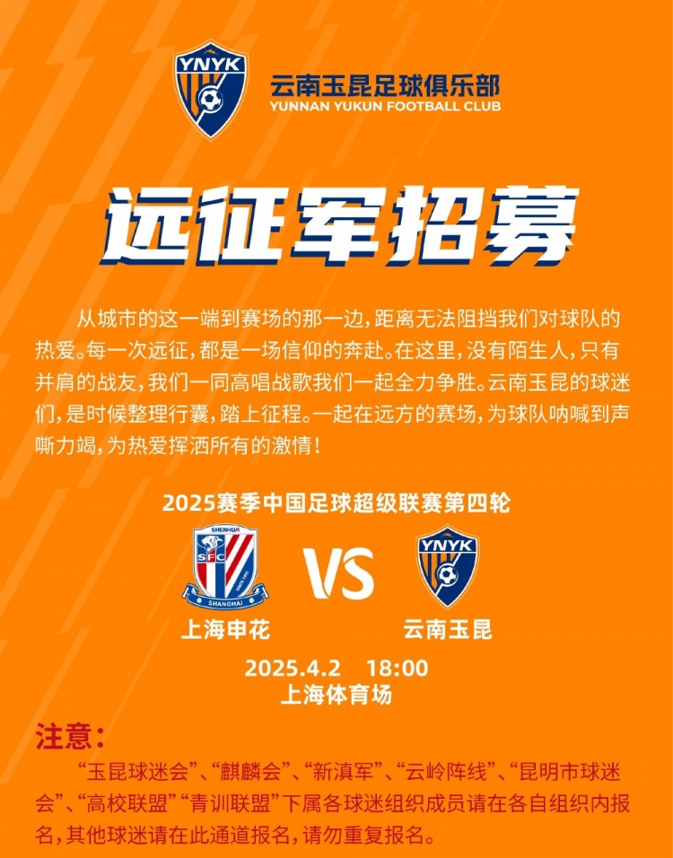 2025-03-25 21:02:30中超第4輪云南玉昆將客場(chǎng)挑戰(zhàn)上海申花,球迷遠(yuǎn)征報(bào)名已正式開(kāi)啟