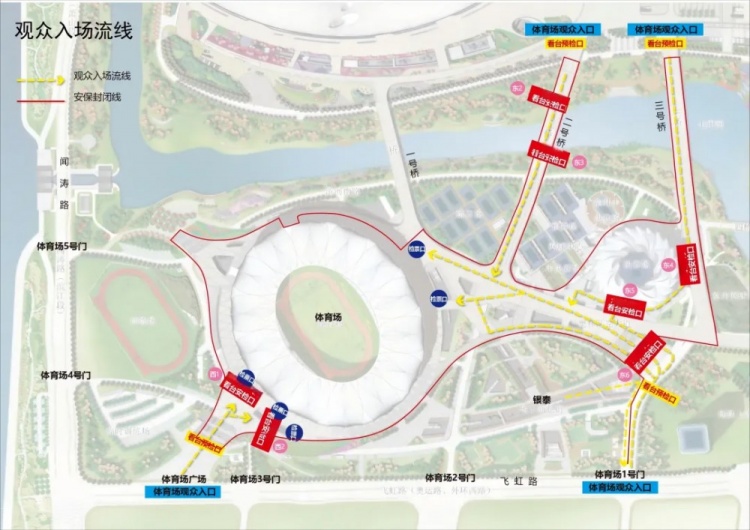 抵達現(xiàn)場的觀眾,可經(jīng)由 1 號門、西廣場、2 號橋以及 3 號橋前往體育場入口,有序入場。建議龍之隊、長城、中國制躁等有組織的球迷通過3號橋?qū)S猛ǖ赖竭_安檢口。