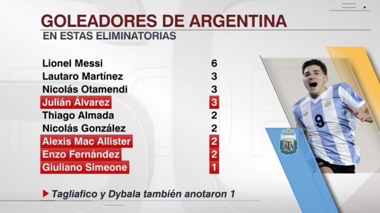 2025-03-26 14:00:24本屆世預(yù)賽阿根廷射手榜:梅西6球,勞塔羅、奧塔門迪、小蜘蛛3球