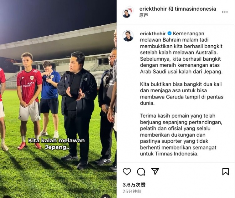 托希爾為這條Vlog配文寫道:“昨晚與巴林隊(duì)的勝利,顯示我們已經(jīng)從慘敗澳大利亞的比賽中振作起來,而此前我們也在客場慘敗日本隊(duì)后,主場擊敗沙特重新振作。我們證明了自己兩度跌倒,兩度爬起,希望我們能繼續(xù)努力,讓印尼足球在世界舞臺上展現(xiàn)自己。”