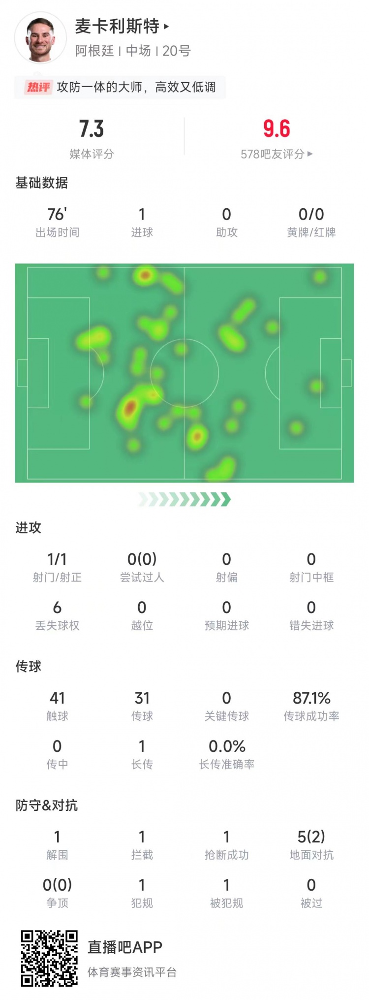 2025-03-26 14:02:17麥卡利斯特本場數(shù)據(jù):射門1次打進1球,傳球成功率87.1%&評分7.3