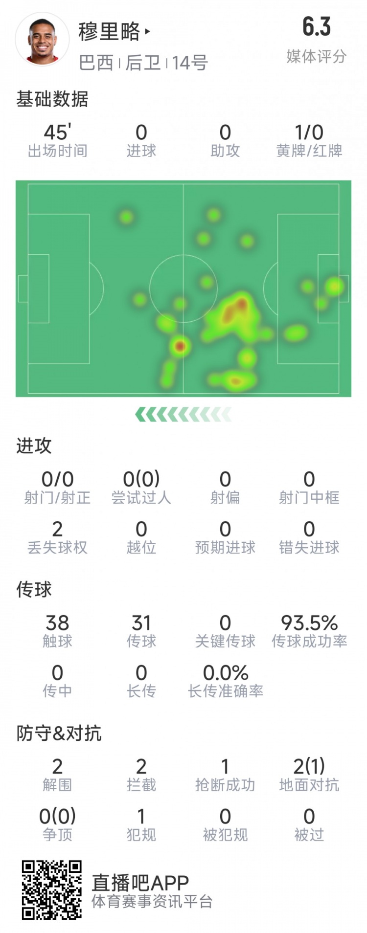 2025-03-26 14:02:36半場被換下,穆里略本場數(shù)據(jù):兩次烏龍助攻,2解圍&2攔截