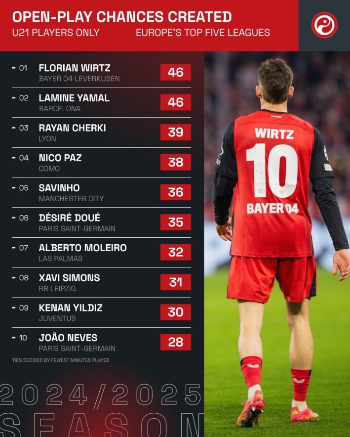 2025-03-27 07:00:20五大聯(lián)賽U21運動戰(zhàn)創(chuàng)造機會排行:亞馬爾、維爾茨46次并列榜首