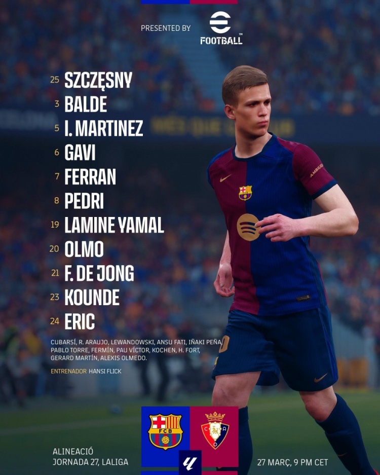 巴薩替補:31-迭戈-科亨、13-佩尼亞、2-庫巴西、4-阿勞霍、38-奧爾梅多、32-福特、35-馬丁、14-托雷、16-費爾明、9-萊萬、10-法蒂、18-保-維克托