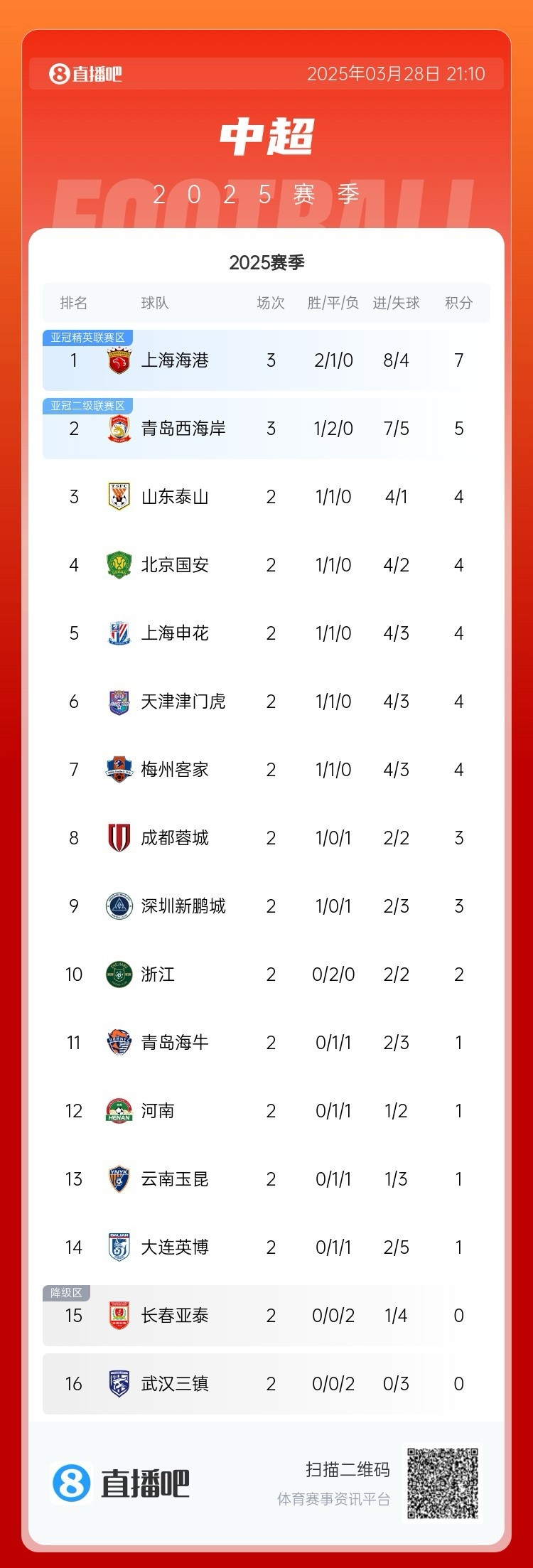 2025-03-29 00:08:13海港3-3絕平西海岸,本賽季中超3輪后已無全勝球隊