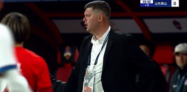 上半場(chǎng)補(bǔ)時(shí)第5分鐘,主裁判向梅州客家主帥米蘭-里斯蒂奇出示黃牌警告。↓