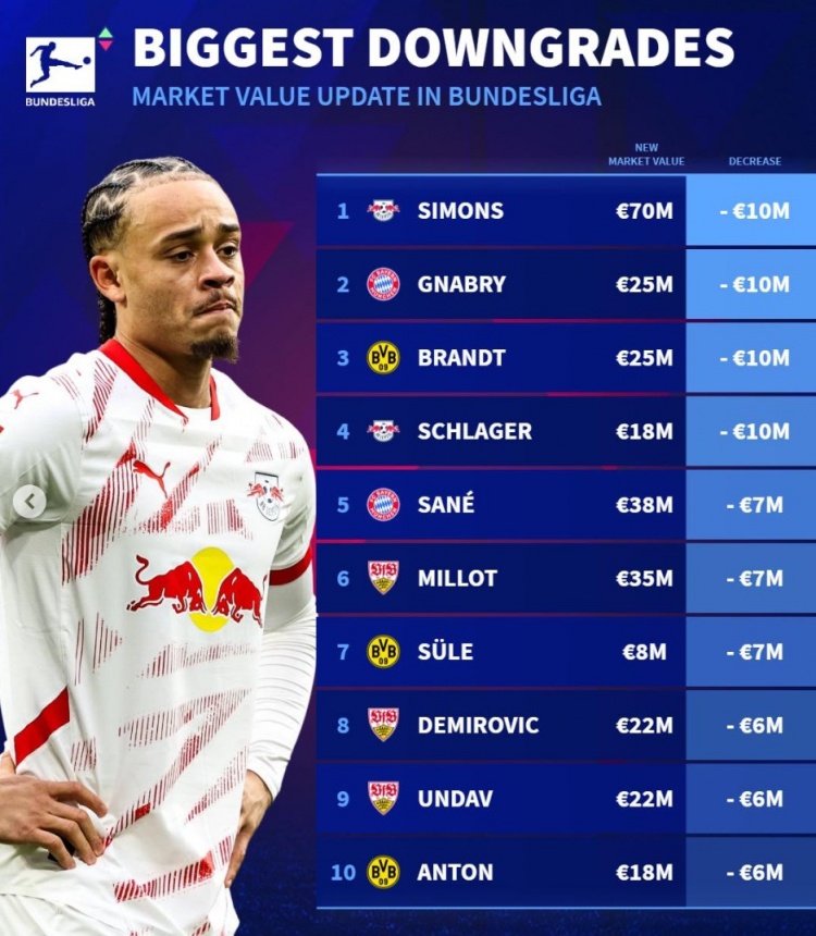 2025-03-30 07:00:05德甲身價貶值榜:西蒙斯&格納布里下跌1000萬,薩內(nèi)&聚勒降700萬