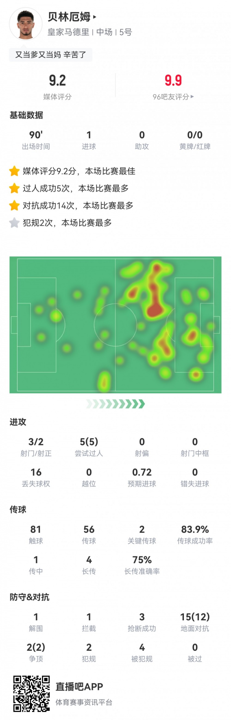 2025-03-30 07:00:31貝林數(shù)據(jù):1進球,5次過人全成功,14次成功對抗,全場最高9.2分