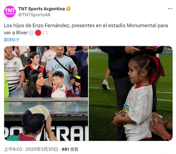 2025-03-30 14:01:33恩佐女友帶著孩子來到紀(jì)念碑球場,現(xiàn)場觀看恩佐母隊(duì)河床比賽