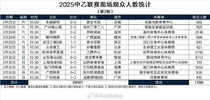 2025-03-31 14:00:21中乙第2輪現(xiàn)場觀眾:四場超千人,泰山B隊主場8113人最多