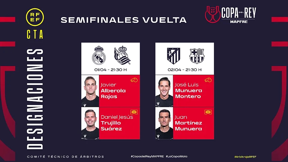 2025-03-31 21:01:30國王杯半決賽次回合裁判:羅哈斯執(zhí)法皇馬,蒙特羅吹巴薩vs馬競