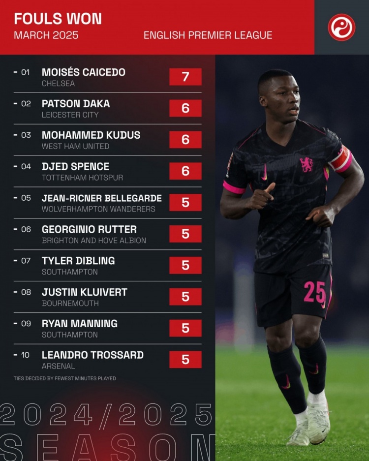 2025-04-01 14:01:38英超3月制造犯規(guī)次數(shù)榜:凱塞多7次居首,庫杜斯6次&特羅薩德5次