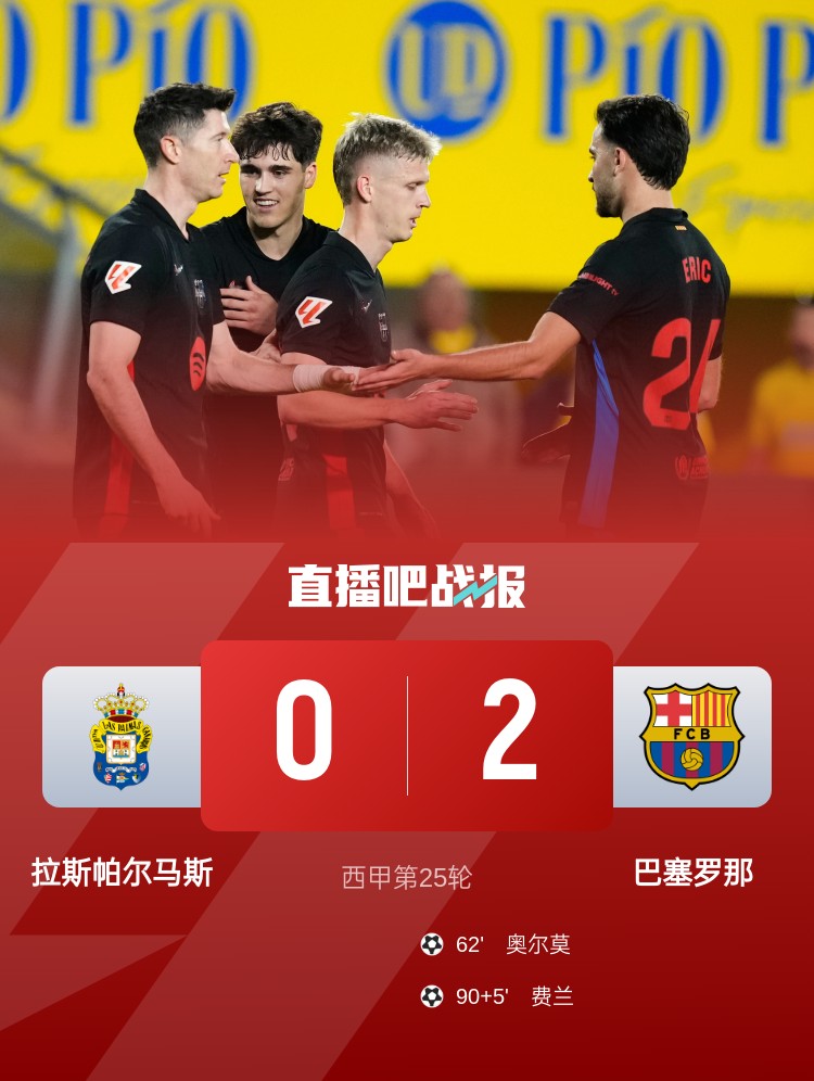 西甲第25輪,巴薩2-0拉斯帕爾馬斯1分優(yōu)勢領(lǐng)跑,奧爾莫、費蘭進球。