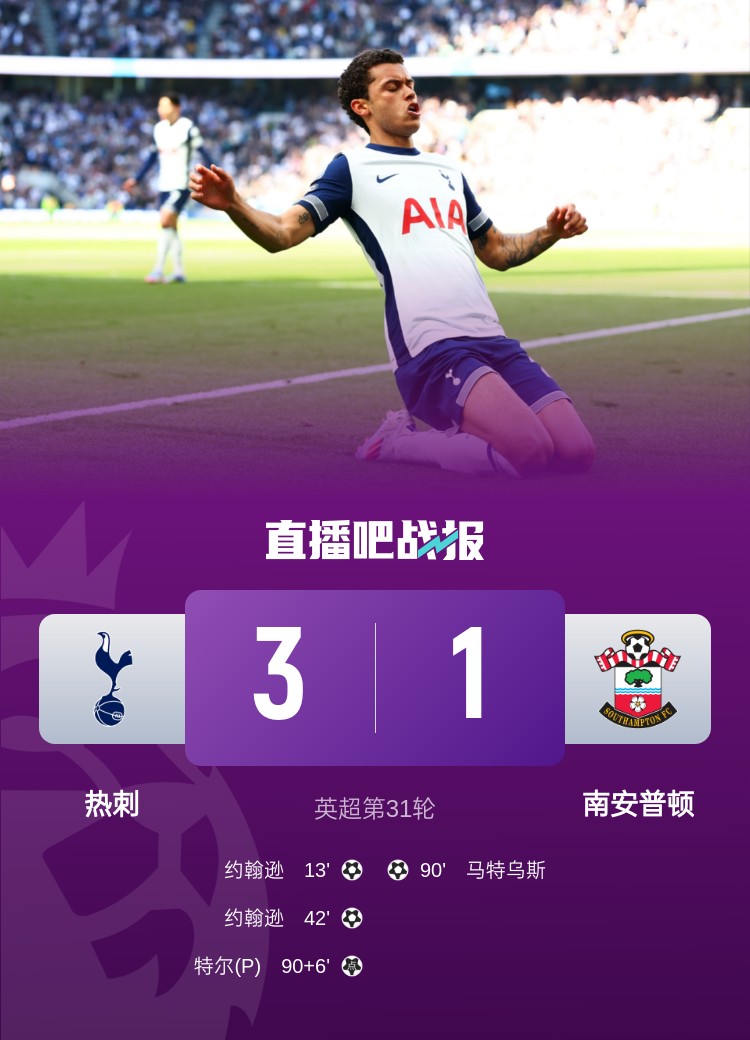 熱刺本輪3-1擊敗南安普頓,圣徒在聯(lián)賽剩余7輪的情況下提前降級(jí),也創(chuàng)下了聯(lián)賽紀(jì)錄。