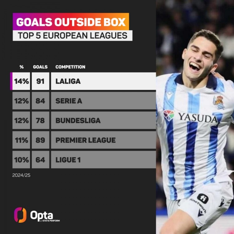 2025-02-24 07:00:10西甲本賽季禁區(qū)外進(jìn)球占比14%,該項(xiàng)數(shù)據(jù)五大聯(lián)賽最高