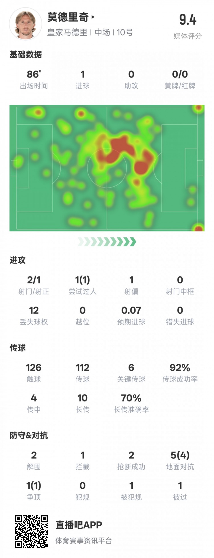 莫德里奇本場(chǎng)比賽具體數(shù)據(jù)如下: