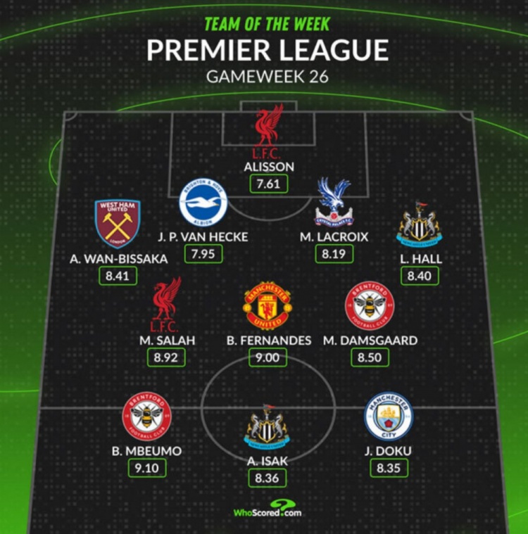 2025-02-24 21:00:20Whoscored評(píng)本輪英超最佳陣:薩拉赫領(lǐng)銜,B費(fèi)、多庫(kù)在列