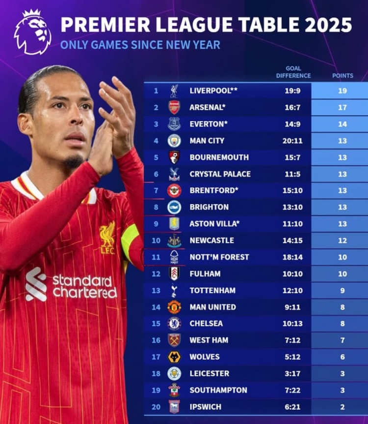 2025-02-26 07:00:392025英超積分榜:利物浦19分、阿森納17分,曼聯(lián)切爾西各8分