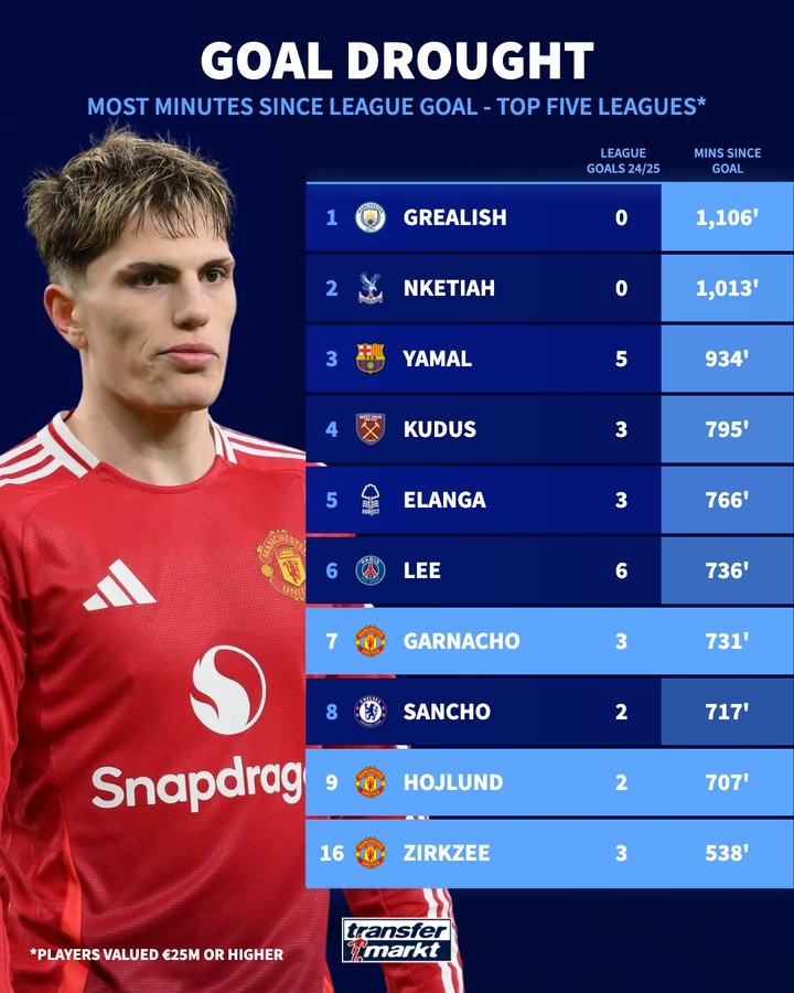 2025-02-26 07:00:41五大聯(lián)賽進(jìn)球荒時(shí)間排名:格拉利什1106分鐘居首 亞馬爾934分鐘