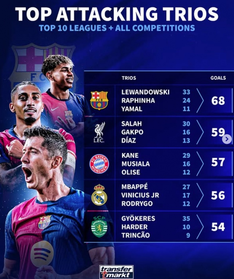 2025-02-26 21:00:07德轉(zhuǎn)列本賽季三叉戟進(jìn)球榜:巴薩68球居首,利物浦&拜仁&皇馬在列