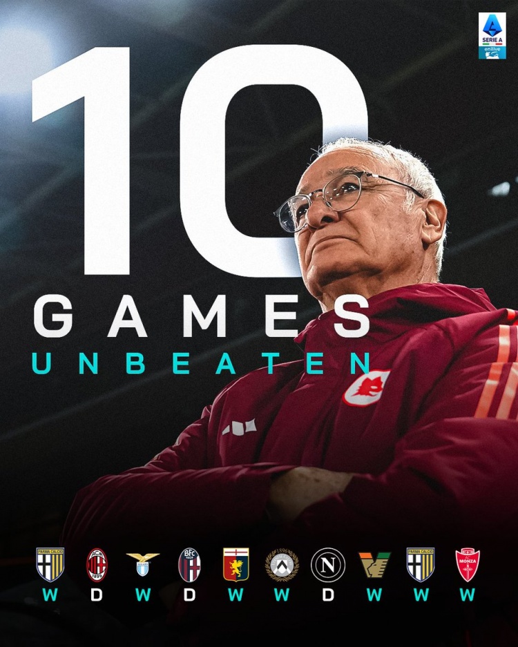 2025-02-27 00:01:287勝3平,意甲官方曬老帥拉涅利帶羅馬過去10輪聯(lián)賽不敗海報