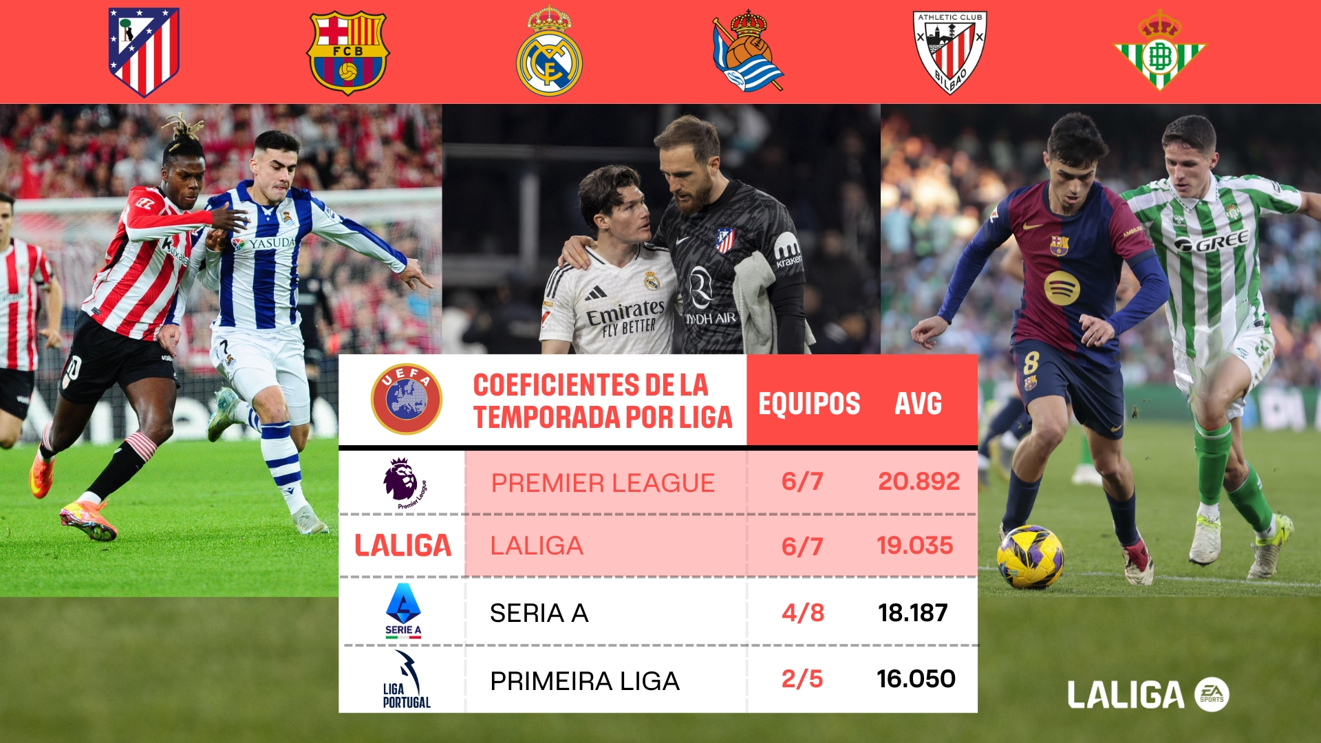 這些西班牙球隊在歐戰(zhàn)中的出色成績,以及他們在此期間獲得的一些重要勝利,提升了西班牙在歐足聯(lián)官方國家排名中的積分系數(shù)。2024-25賽季,只有英格蘭俱樂部的歐戰(zhàn)積分均分(20.892)高于西班牙俱樂部(18.820)。