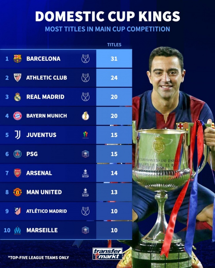 2025-02-28 07:00:22德轉(zhuǎn)列五大聯(lián)賽國內(nèi)杯賽奪冠榜:巴薩31次第1,畢巴24次第2