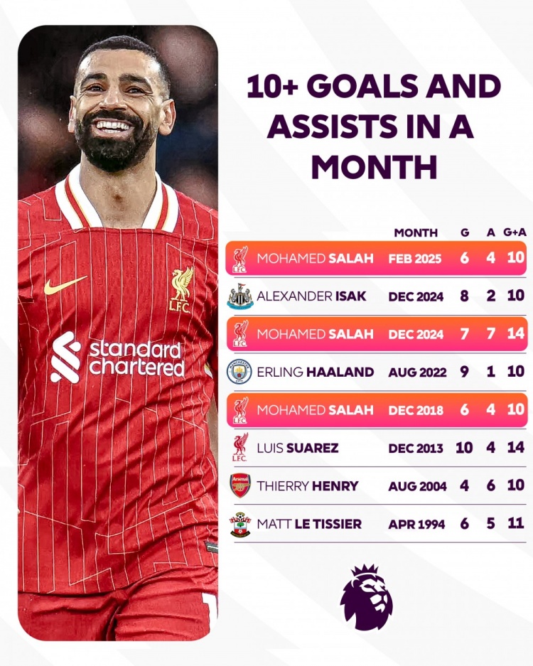 2025-02-28 14:00:283次!薩拉赫是英超歷史唯一的多次單月聯(lián)賽制造進球上雙的球員
