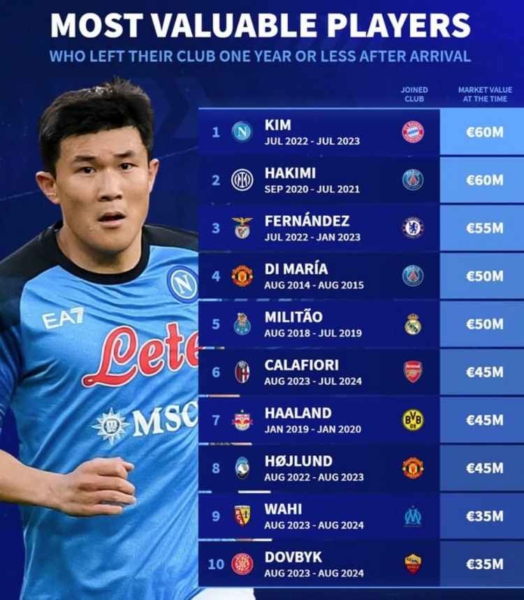 3月1日訊 《轉(zhuǎn)會市場》統(tǒng)計了加盟球隊一年內(nèi)便轉(zhuǎn)會離隊的球員身價最貴榜單,金玟哉和阿什拉夫并列居首。