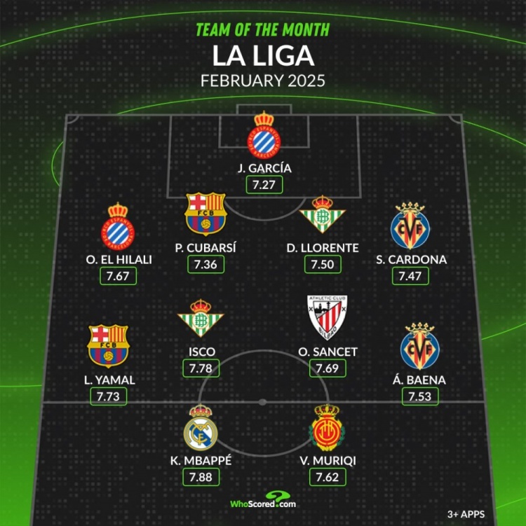 2025-03-02 21:00:15whoscored西甲2月最佳陣:姆巴佩、亞馬爾領(lǐng)銜,伊斯科在列