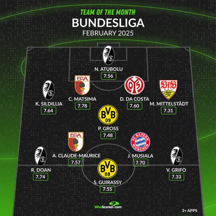 2025-03-03 00:01:29whoscored德甲2月最佳陣:穆西亞拉領(lǐng)銜,吉拉西&堂安律在列