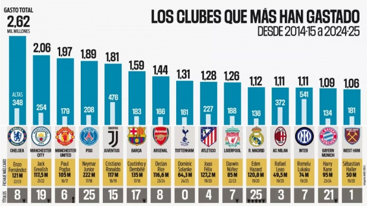 2025-03-03 00:01:58過去十年轉(zhuǎn)會(huì)投入榜:切爾西26億歐第一,英超BIG6&皇薩仁全上榜