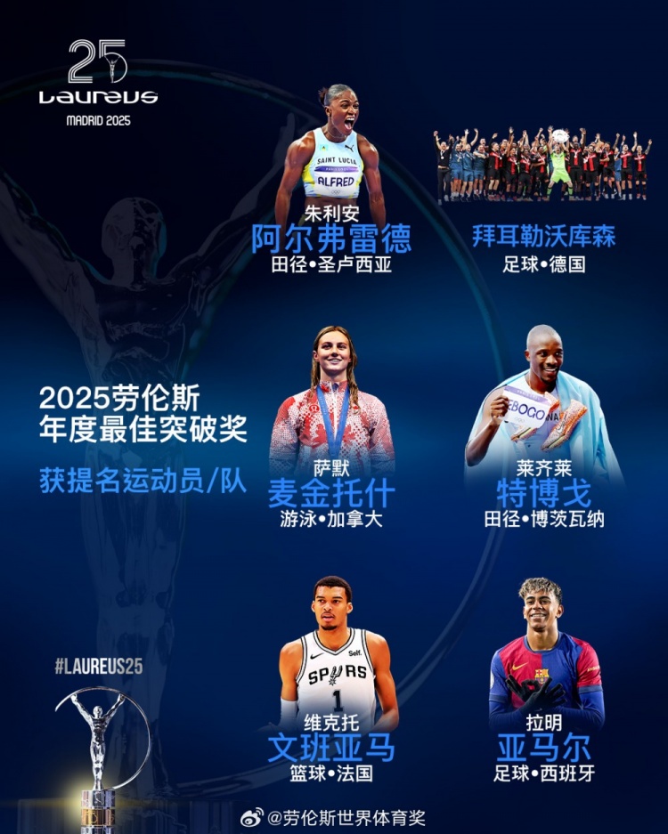 2025-03-03 21:03:03勞倫斯年度最佳突破獎提名:勒沃庫森、亞馬爾、文班亞馬入圍