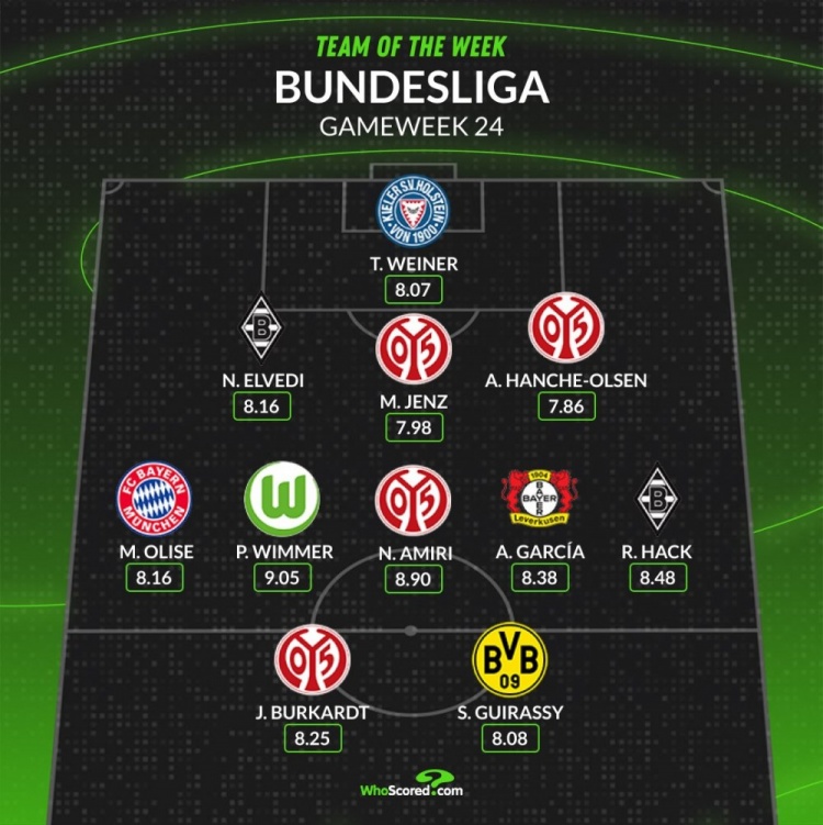 3月3日訊 德甲第24輪聯(lián)賽已經完賽,whoscored也統(tǒng)計了本輪德甲評分最佳陣容,美因茨成為最大贏家。
