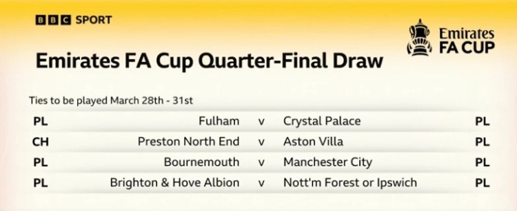 2025-03-04 07:00:05足總杯8強對陣:伯恩茅斯vs曼城,布萊頓vs諾丁漢森林