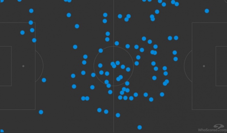 中場的傳球散點(diǎn)圖:幾乎沒有幾次好的向前機(jī)會(huì)