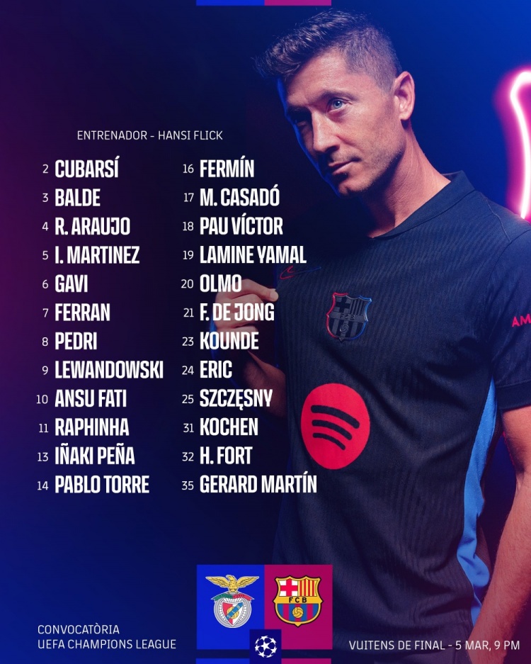 2025-03-04 21:01:28巴薩歐冠客戰(zhàn)本菲卡名單:萊萬、亞馬爾、加維、奧爾莫在列