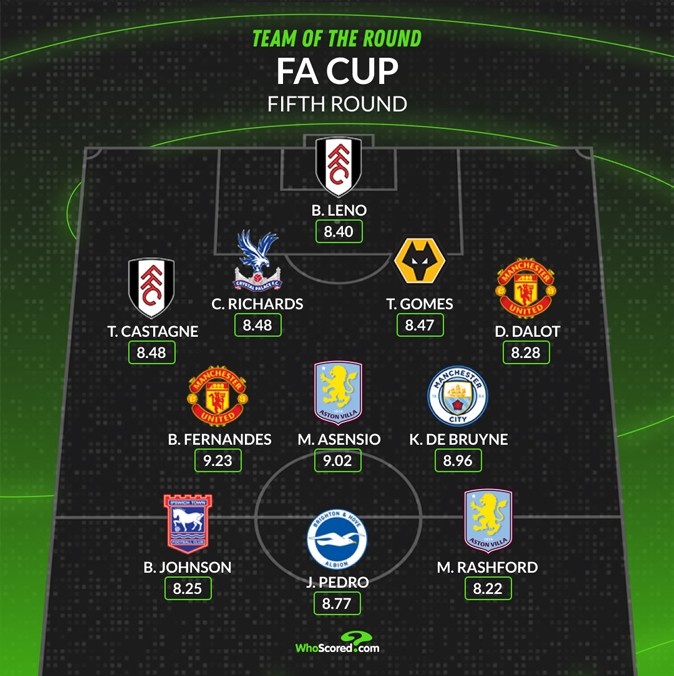 3月4日訊 足總杯十六強(qiáng)戰(zhàn)已經(jīng)完賽,whoscored也統(tǒng)計了本輪足總杯評分最佳陣容,富勒姆、維拉和曼聯(lián)各2人入圍。