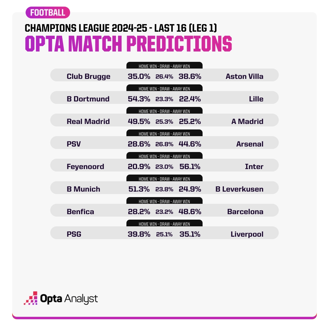 Opta預(yù)測(cè)歐冠16強(qiáng)賽首回合勝率: