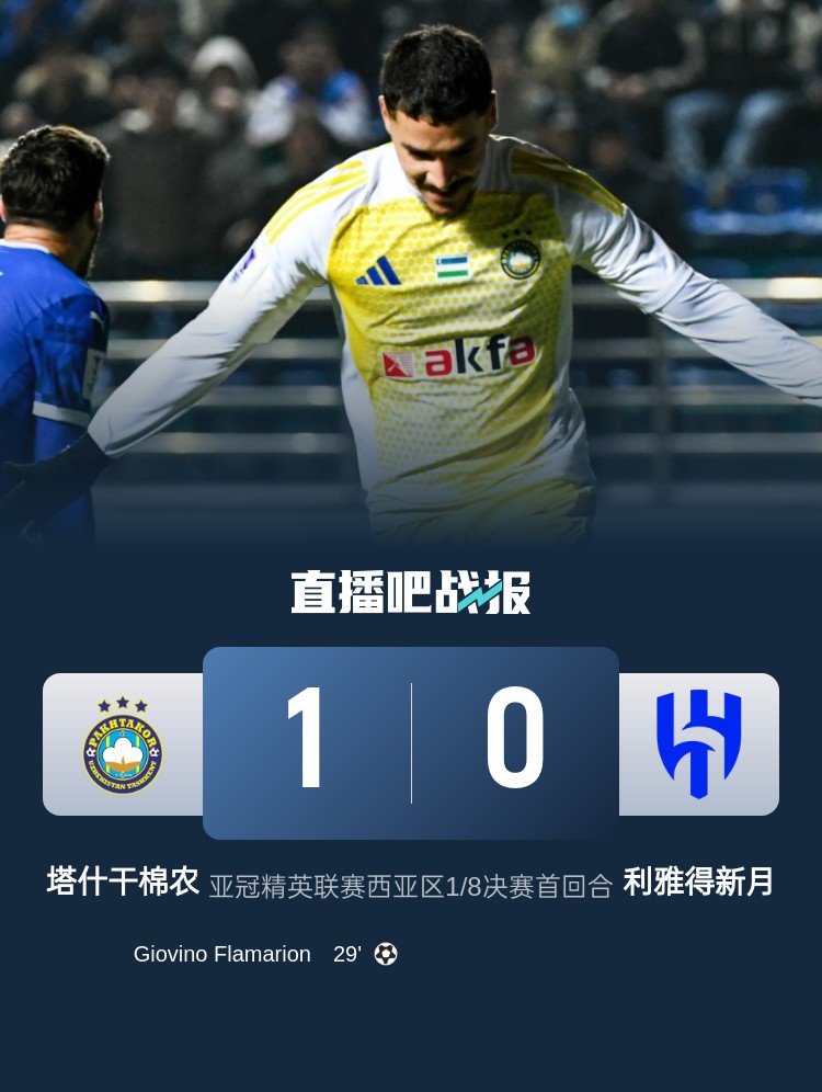 亞冠精英聯(lián)賽西亞區(qū)1/8決賽首回合,利雅得新月首回合0-1塔什干棉農。上半場,弗拉馬里昂撞射破門,布萊希傷退;下半場,米林科維奇錯失良機,新月完成一次門線解圍。