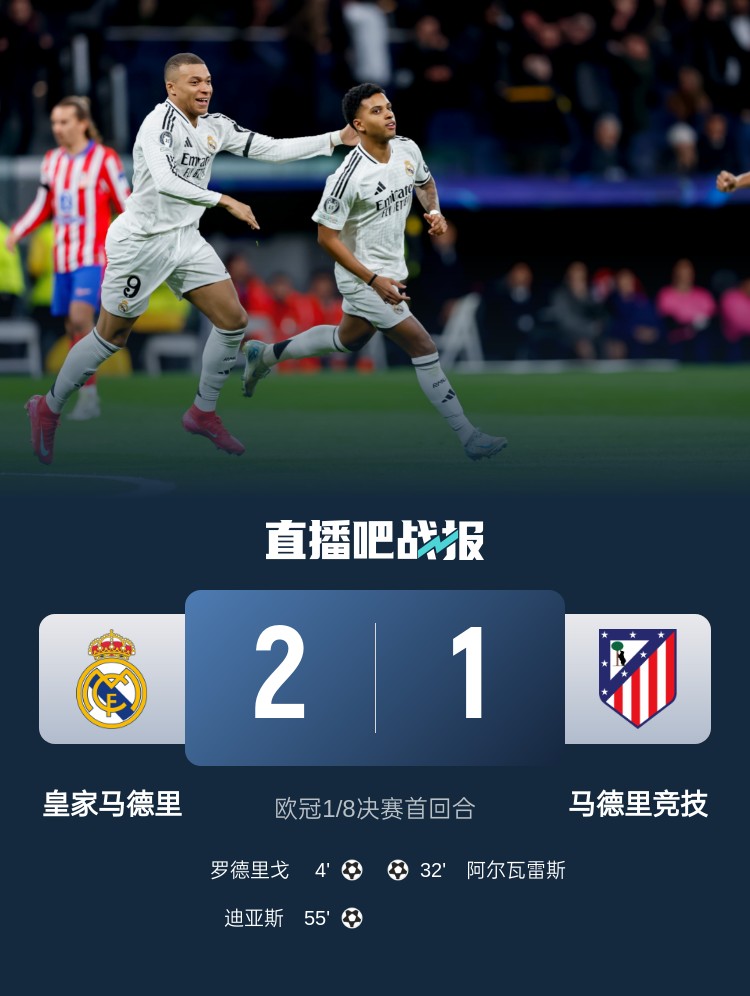 歐冠1/8決賽首回合,皇馬2-1馬競,占據(jù)晉級先機。上半場,巴爾韋德助攻羅德里戈內切擺脫防守破門,阿爾瓦雷斯過掉卡馬文加后世界波扳平;下半場,卜拉欣-迪亞斯禁區(qū)內蝴蝶穿花步過人后建功。