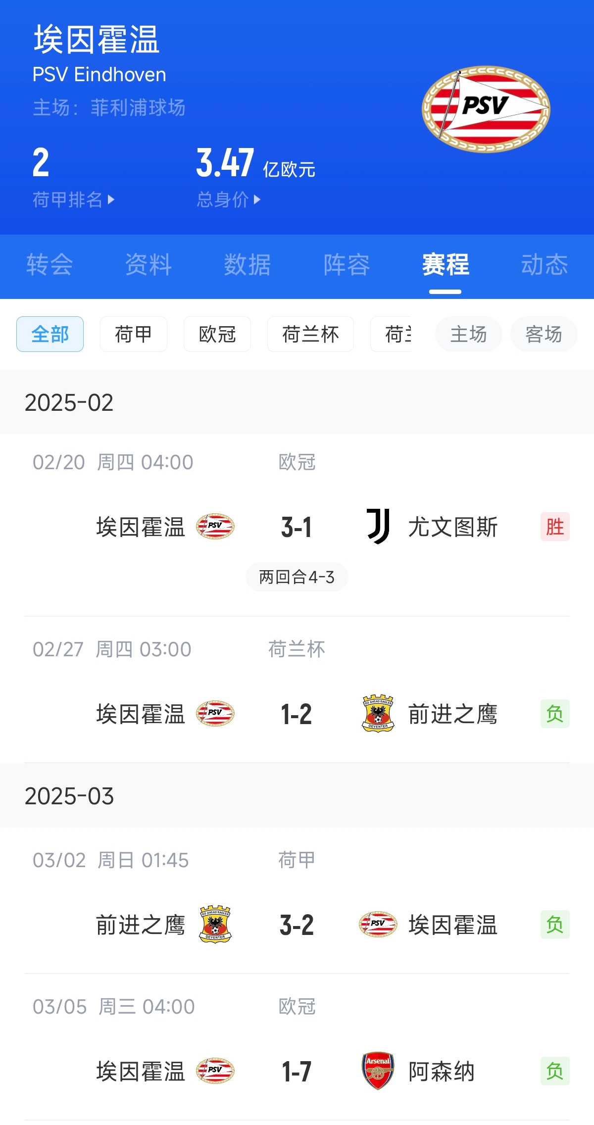 03月05日訊 歐冠16強(qiáng)比賽首回合,埃因霍溫在主場(chǎng)1-7被阿森納擊敗。在歐冠附加賽3-1逆轉(zhuǎn)尤文之后,埃因霍溫各項(xiàng)賽事3連敗。另一場(chǎng)布魯日則是主場(chǎng)1-3不敵維拉,雙殺亞特蘭大后1平2負(fù)1勝難求。