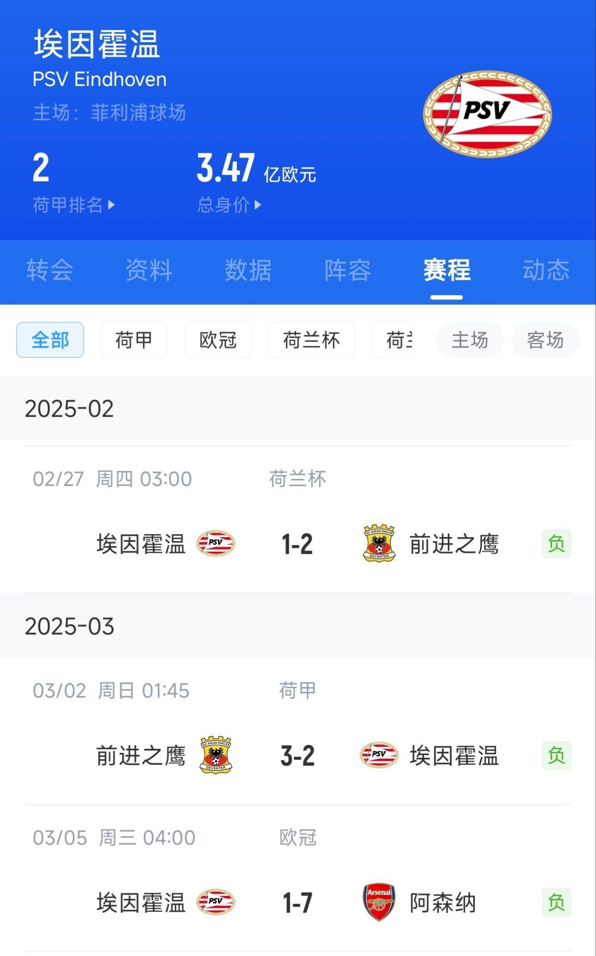 2025-03-05 14:01:23噩夢(mèng)席卷而來(lái)!埃因霍溫一周內(nèi)荷杯出局&荷甲8分落后,歐冠被爆捶