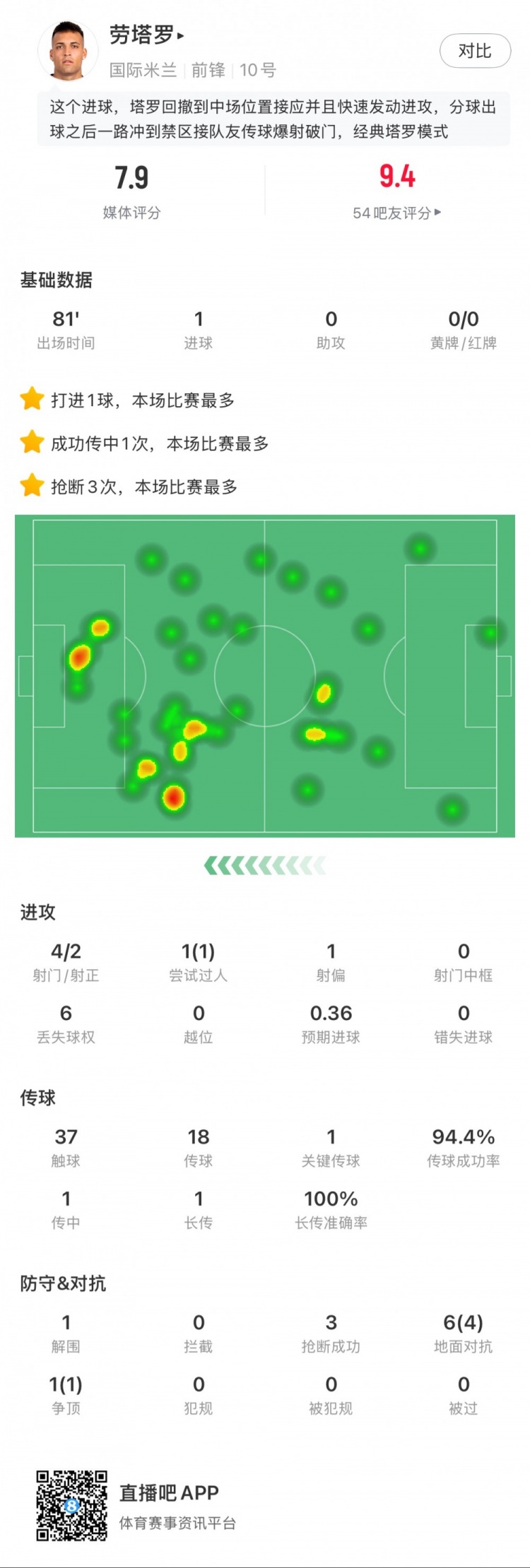 2025-03-06 07:01:21勞塔羅本場數(shù)據(jù):1粒進(jìn)球,4次射門2次射正,3次搶斷