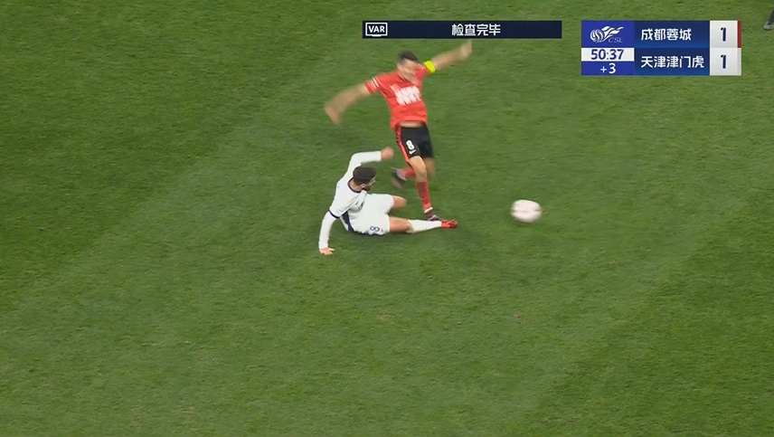 中超聯(lián)賽第2輪,成都蓉城VS天津津門(mén)虎,比賽第45+3分鐘,成都蓉城8號(hào)隊(duì)員在爭(zhēng)搶球時(shí)疑似踩踏天津津門(mén)虎8號(hào)隊(duì)員,裁判員未判罰犯規(guī),VAR介入,裁判員經(jīng)在場(chǎng)回看后,判罰成都蓉城8號(hào)隊(duì)員嚴(yán)重犯規(guī),并向其出示紅牌罰令出場(chǎng)。
