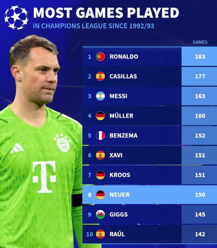 2025-03-07 00:04:14改制后歐冠出場榜:C羅183場、梅西163場,諾伊爾150場列第8