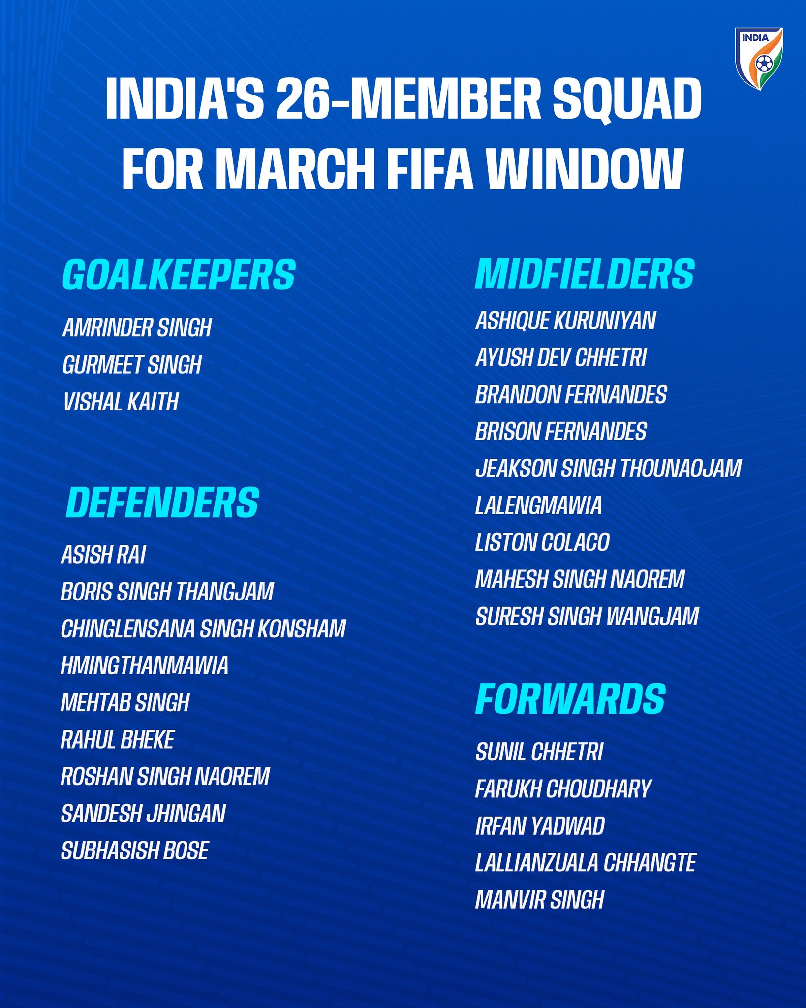 印度將在3月19日友誼賽對陣馬爾代夫,3月25日亞足聯(lián)亞洲杯預(yù)選賽對陣孟加拉國。