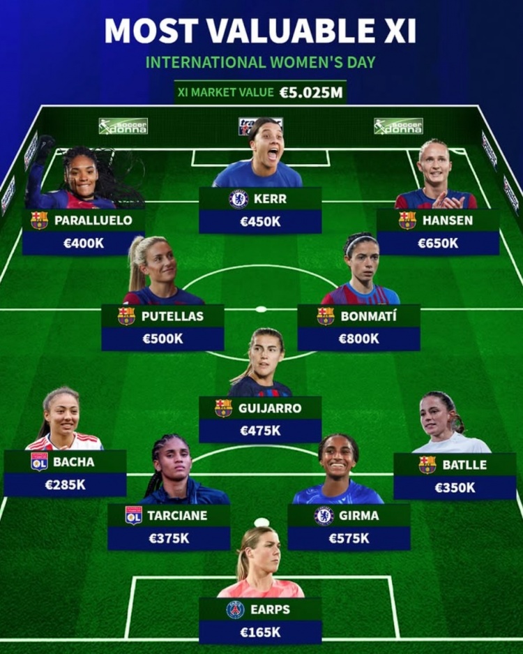 3月8日訊 時(shí)值國(guó)際婦女節(jié),《轉(zhuǎn)會(huì)市場(chǎng)》也列出了當(dāng)前女足身價(jià)最貴陣,巴塞羅那女足6將在列。