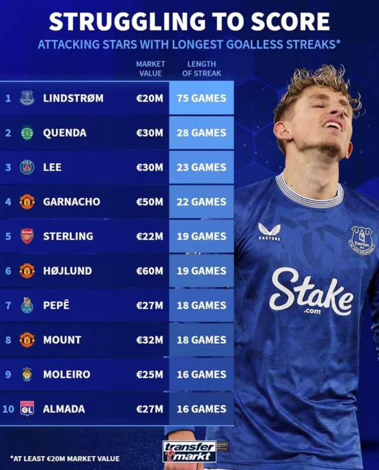 3月8日訊 《轉(zhuǎn)會市場》統(tǒng)計了當(dāng)前身價超過2000萬歐元的攻擊手當(dāng)前進(jìn)球荒情況,林德斯特倫斷崖式居首。