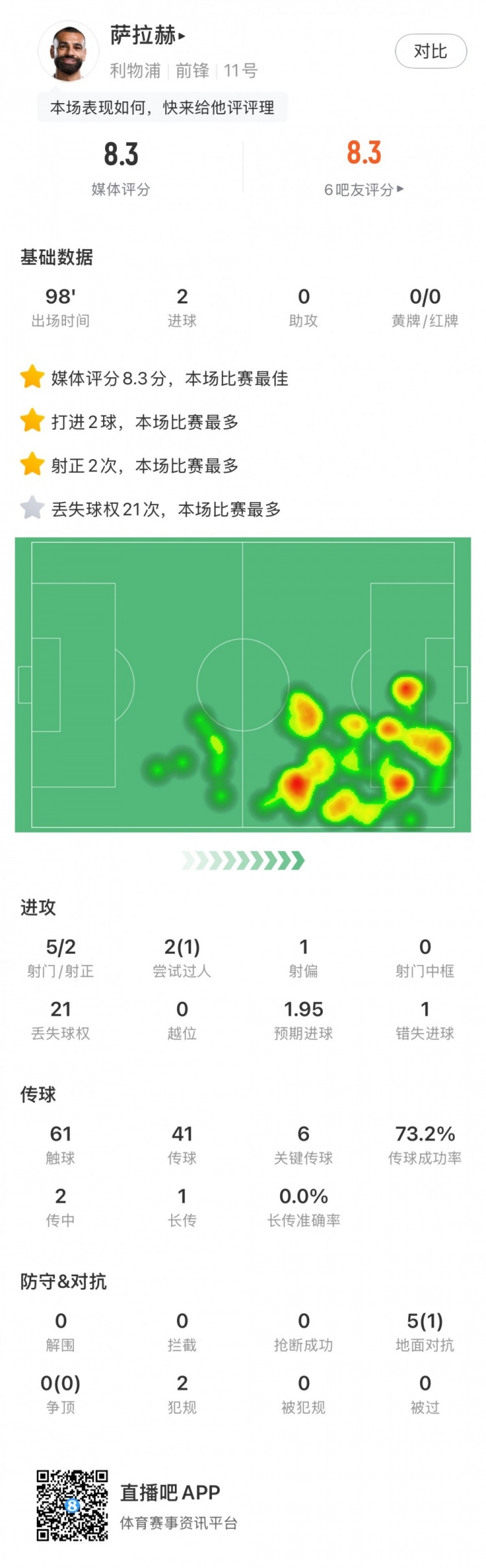 薩拉赫全場(chǎng)數(shù)據(jù)如下: